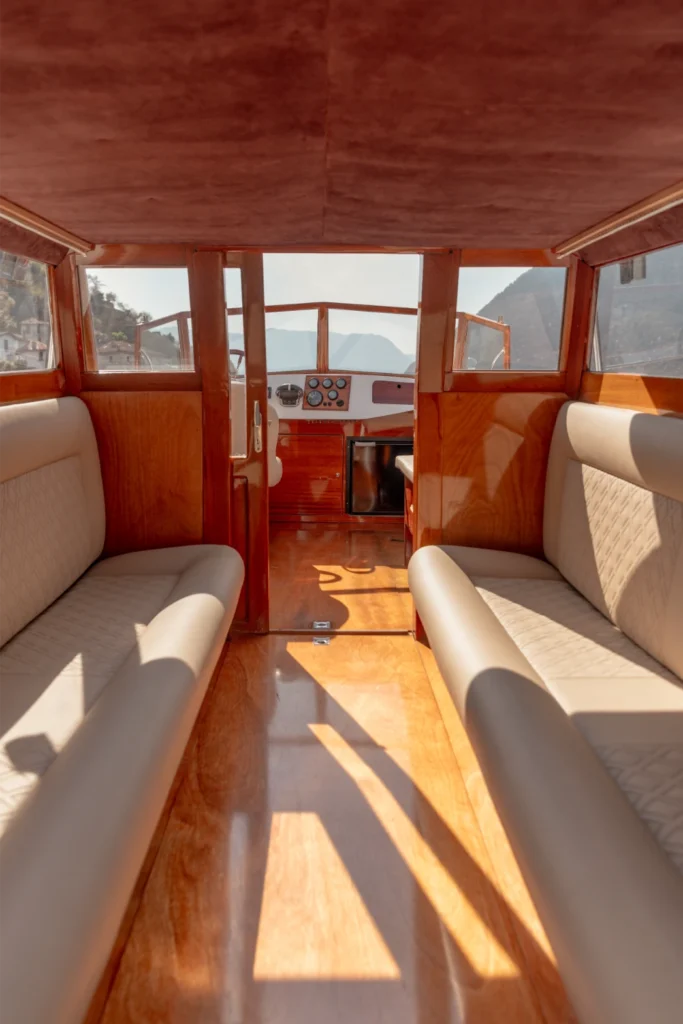 Built in Venice, Italy, it features fine wooden finishes and handcrafted details by traditional Venetian boat builders. A water limousine fully restored in 2026, represents elegance and high capacity, perfect for groups from 2 to 10 people. It offers a spacious cabin with comfortable seating and full amenities, including heating and a sound system. Outdoor seating areas at both bow and stern allow you to fully enjoy the lake scenery. Interior lighting makes it ideal for evening services, ensuring comfort in all weather conditions, including rain or wind.